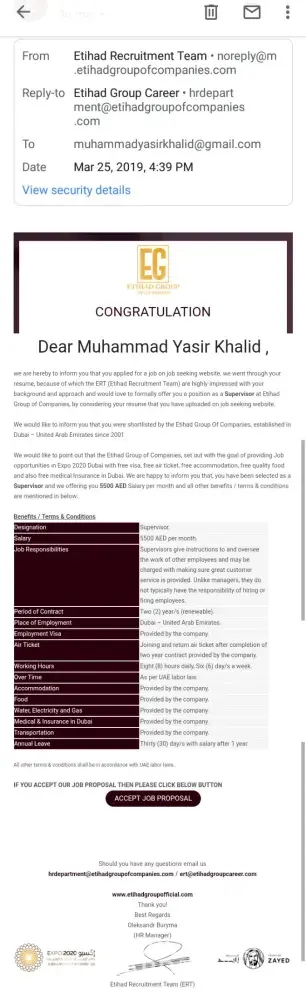 I received an offer letter yesterday from "noreply@m.etihadgroupofcompanies.com" and CC to "hrdepartment@etihadgroupofcompanies.com".