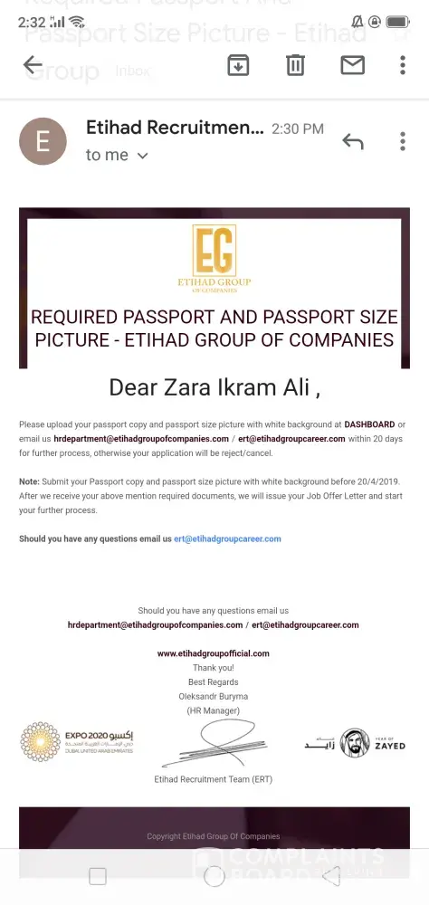 Sir I have received an email from etihad group of companies almost one week before for my appointment as an accountant in your company. They have not demanded money from me just me about passport copy and white background picture.