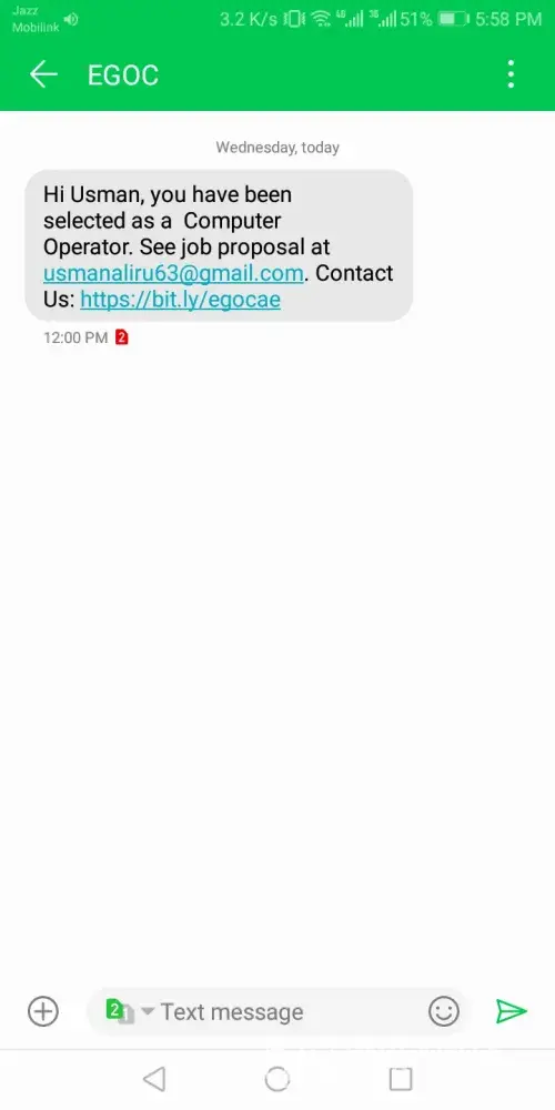 Hello sir.. I received a job offer from etihad group of companies, for the post of Computer Operator, I received also sms on my cell number about job offer by etihad group of companies. Pix are attached about details of phone number from I received sms. And I received email from ([protected]@etihadgroupofcompanies.com) I'm waiting for E-mail about for...