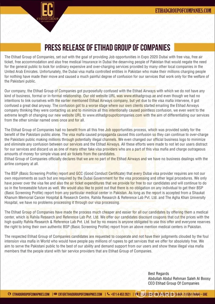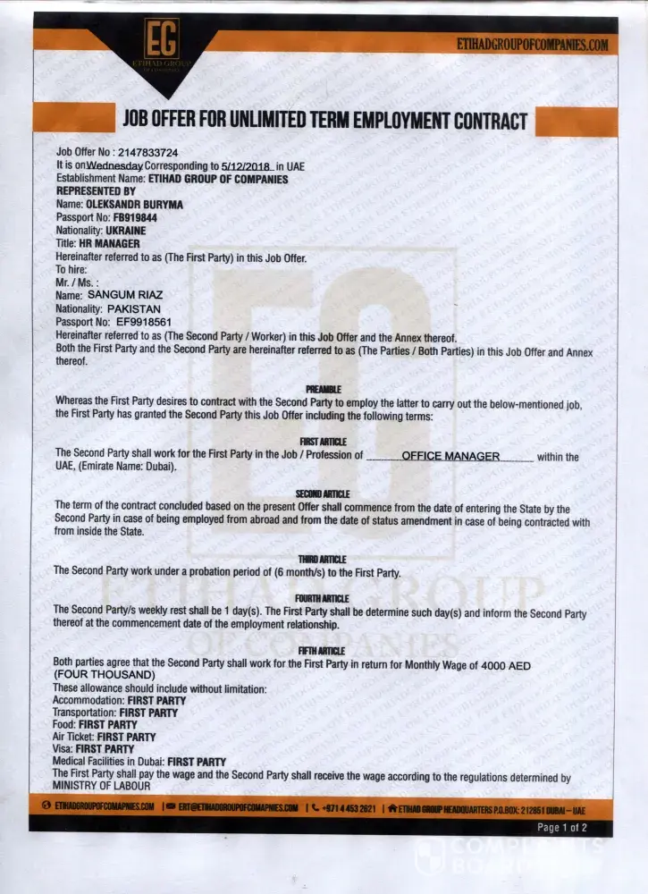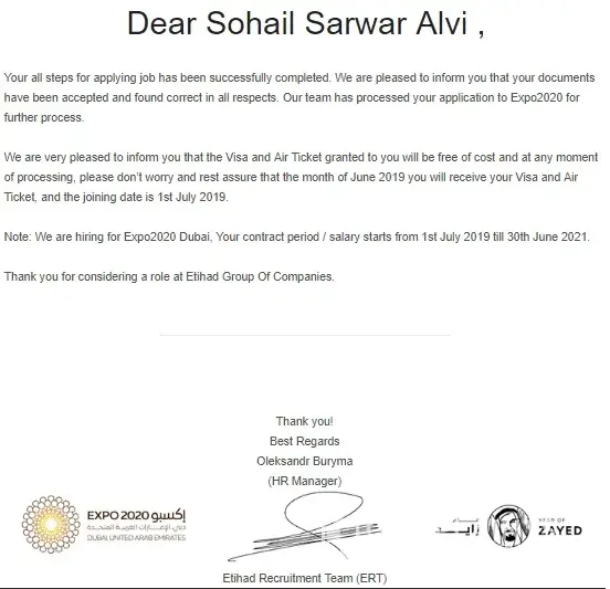 I am Sohail Alvi. Last November this company was offer me as a Sales Manager and Salary was 2800 AED with Visa+Ticket+accommodation and food. After final documentations. Etihad Group of companies has sent confirmation letter with HR manager Signature and Etihad Group of companies stump. I have attached the pic and i am waiting my visa. Etihad Group has promised with me that my duty will be start 01 July 2019 and i will receive visa in June 2019. Now June has come. Kindly confirm me thanks.
