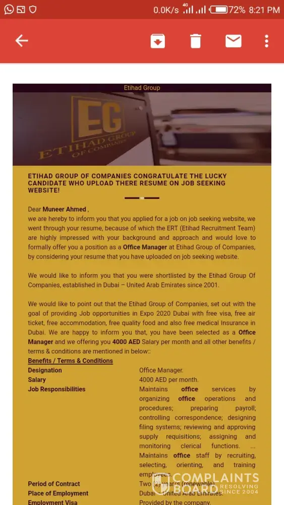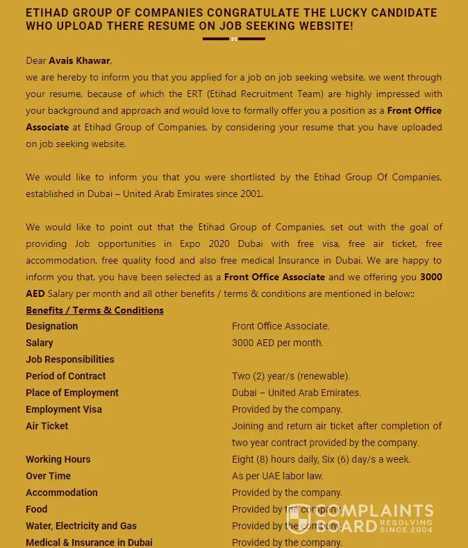 I have received a sms and an email as well from etihad group of companies for selction as assistant supervisor in thier company they have offerred me 4500 drhms salary with allied facilities such as visa (two years contract), ticket accomadation, food and as per labour laws of uae. On reciept of such sms & email i have left my earlier employement because they were not allowing me leave for long two years, it is therefore requested to kindly confirm the fact and if found kindly take action for redressal of grivences of applicant .