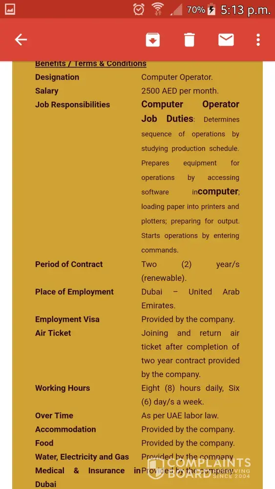 Job offer is of 3000 AED with all facilities. Once I accepted the job offer. I was responded back with two more emails..giving me the login access with password n ID at your official website. After getting logged in it was asking me to upload my passport copy and my passport size picture...