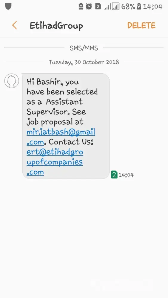 I received email and also sms on my cell number about job offer by etihad group of companies.
