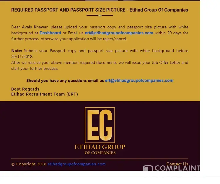 Hello sir.. I received a job offer from etihad group of companies, for the post of Front office associate, they are offering me 3000 aed. With all facilities provided by company.. They demanded me passport copy and photos to upload on their website for the further process.. Kindly tell me is it fake or real... I received email and also sms on my cell number about job offer by etihad group of companies. Pictures are attached about details of Email from ([protected]@etihadgroupofcompanies.com)