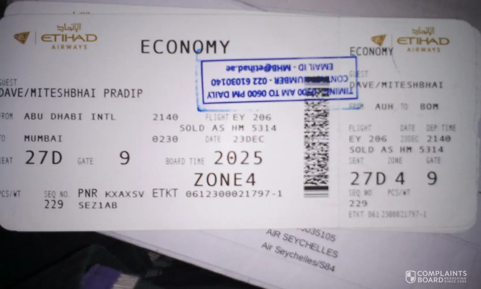 In this regards, I, Mitesh Dave had traveled from Mahe Island-Seychelles to Mumbai-India on Dtd.23/12/2016 with my Family total Four Members including me. While I come to Mumbai and when I received my Baggage I found it is in totally Damaged due to was Mishandled and it is not possible to Carry Over from Mumbai to Bhuj-Gujarat my Native Place.So I contacted airline Officer at Mumbai Airport but they all are behaving like they are King of the Eithad Airways and no body had taken my complain even so due to that I am writing your good self. So I request to your good self kindly find attached herewith my all Four Tickets with Boarding Pass and Damaged Bag and Weight Tag for your ready reference and file my complain in this regards and revert me ASAP.