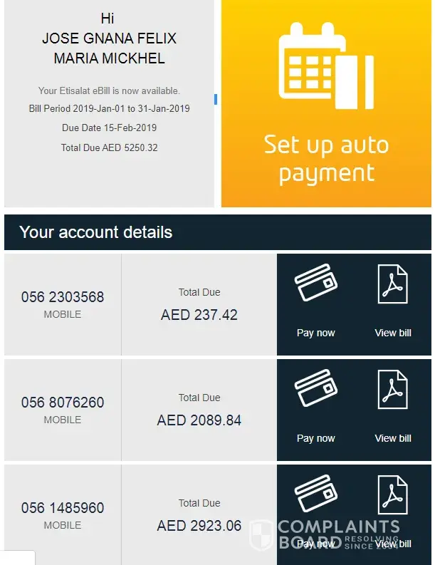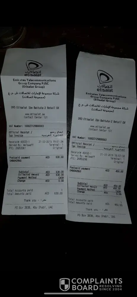 So I have taken a elife service from etisalat, on the month of november for home service from them. Out of a sudden I have to go back to my country as soon as possible. So I had gone to the business center in ibn battuta mall in the etisalat department. When I reached there the agent cleared all the bills on 21st march 2019 till the month of march. And she had mentioned that all the bills are settled. And you have nothing to pay as it even reflected on the system. I will be posting the picture of the receipt too below. So on 30th march she had told to give a confirmation so I had called them on 30th march itself for the cancellation of the home services. And they confirmed me with so and said it will be done in a week. On 7th april i'm getting a call from them saying to make more payments. I told them that the agent said to ke before that the payments are already cleared and I had paid the exit charges also. But still they are insisting to pay. So I registered a complaint on the agent who told me on 21st march that the account are cleared already. Today after a month of daily conversations with them. They are still not giving me a valid reason for me to pay the amount. The pictures that I have attached is of both the reference number and the copy of the bill, received by the agent name and the platform where I was sitting.