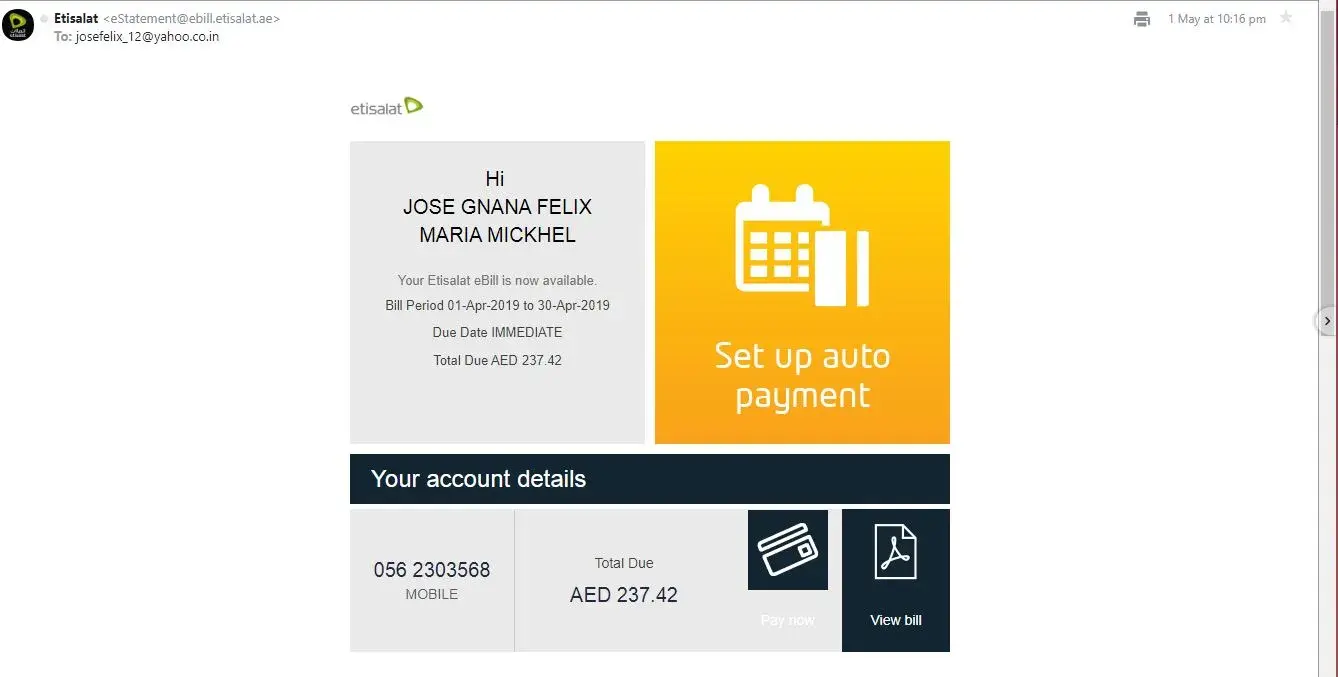 I have received a message on my ethisalat mobile no.[protected], stating that Payment not received AED 937.46 FOR ACCOUNT NO.[protected] from etisalatINF on 12th of August 19:54 hours. I kindly request to look into this matter & I do state that [protected] is not my mobile number & account. So I kindly request you to take action immediately & find the person who is using the above number, or kindly find out if my emirates ID has been misused.