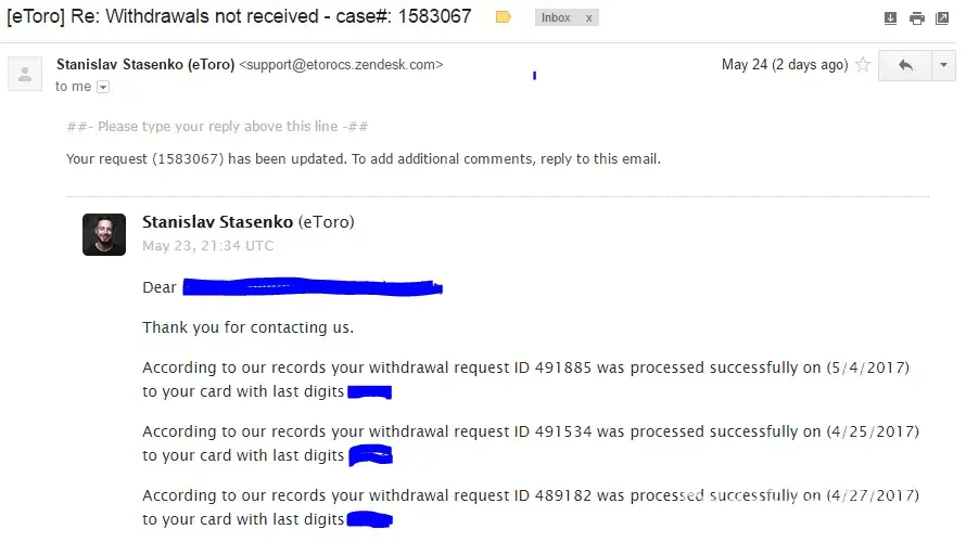 I am requesting my withdrawal and I have done everything I can to contact them. Its been 11 days and dont have my money still. I followed the rules and verified my account and did not violate any issue to the platform or etoro. They keep sending automatic system generated response. I do visit their website and keep filing a complain ticket and sending message to their e mail but no response now. Please help me to get my money back.