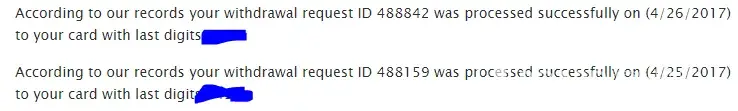 they told me that your withdrawals have been processed successfully in the 1st date that you made the withdrawal!