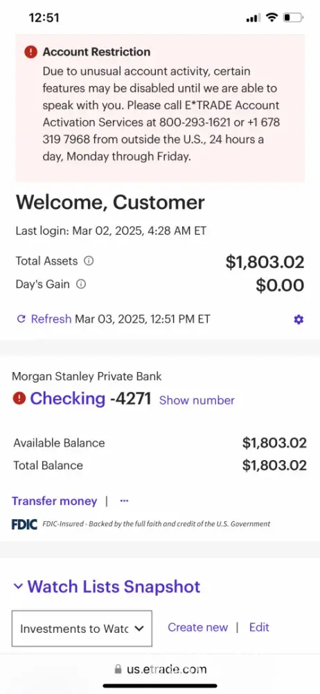 E*Trade placed a restriction on my account because I did not meet newly imposed US residency requirements. I have been trying to transfer my assets away from E*Trade since August 2023 but not making any progress.