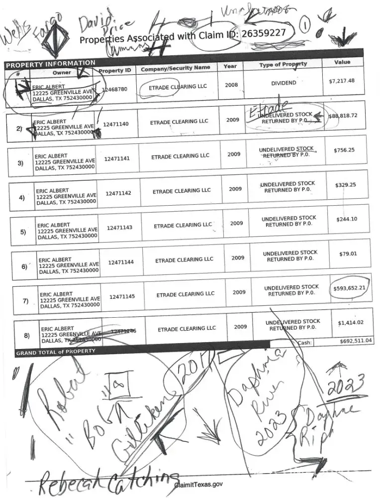 An account was opened under Eric Albert 12225 Greenville Ave Dallas, Tx 75243 in 2005-2009. I never received any statements nor communication from ETrade. The funds were escheated to the Texas Unclaimed Property Division in 2008 and 2009. I have been requesting a copy of my statement accounts from ETrade and can not talk to anyone who will locate any...