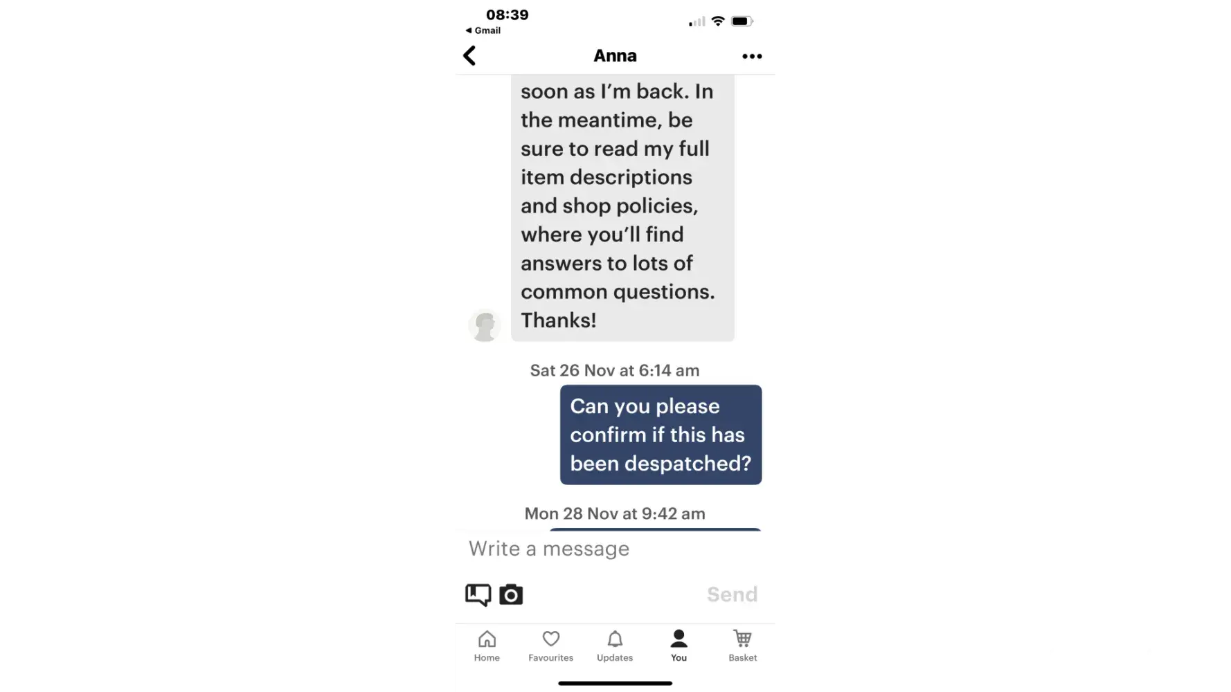 I placed an order 8th november for a personalised bag for my wedding dress #[protected]. It said I would receive by 19th. It didn't, so I chased it to be told there was a delay, and it was being done the following week, still nothing, the seller completely ignores my messages, I opened a case and was told to continue to communicate with the seller as I still wanted my item, still I am just being constantly ignored and item has not been sent, please see screen shots of communication or lack of it below, I just want what I paid for. This is the second order in a matter of weeks that I have paid for and ordered in good faith and not received, also order no #[protected], this also has not shown up, seller said they would send replacement, and this still has not turned up, do you keep letting sellers take money from people who are pretending to offer a service that they clearly dont... These must be just scammers with fake reviews and I for one will not be using etsy again as I have been let down too many times