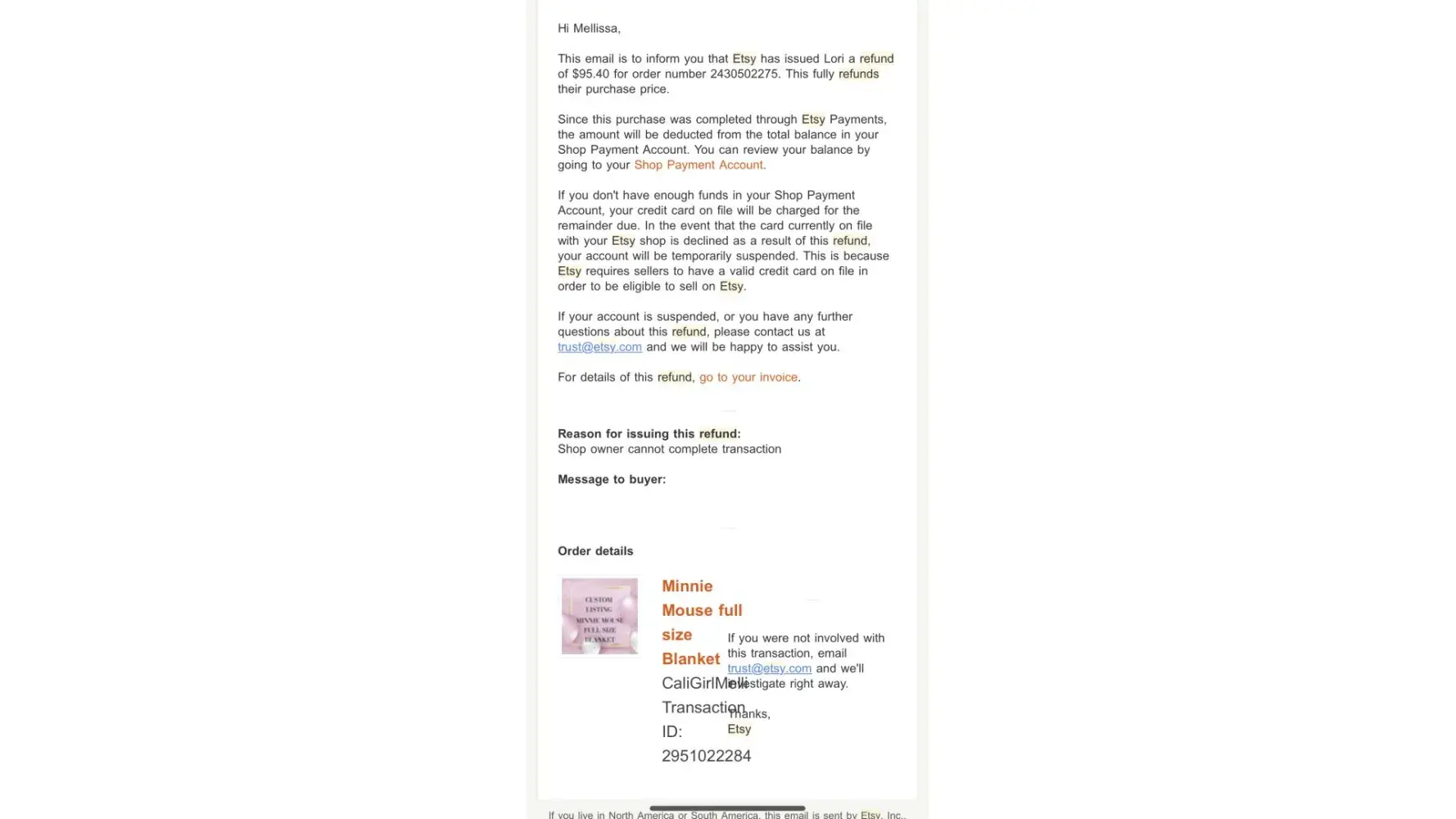 Below is the email from Etsy where it clearly states that the refund was issued straight from my Etsy balance. I closed my shop on Etsy and went else where as fees are crazy. Either way I was never made aware that you never received the refund. My account with Etsy was completely closed and I owe them nothing I have no idea what the issue really is. As far as the messages you were made aware step by step of what was going on and I agreed completely with you and agreed that you deserved the refund as the 2 incidents were just to much for you to continue to deal with as well as I since not you or I can control the shipping carriers. I now sit here with 2 blankets one had to be washed and it’s fine and the other is still in the box. Which is not your fault and I’m so sorry I have no idea what else I can do on my side as the refund was issued successfully and my account with Etsy is closed with no balance owed. I don’t mind if you want to keep the review up that’s your choice I just ask that you removed my personal name and maybe your personal address as I don’t think it’s safe.once again I apologize I hope you have a nice day :)