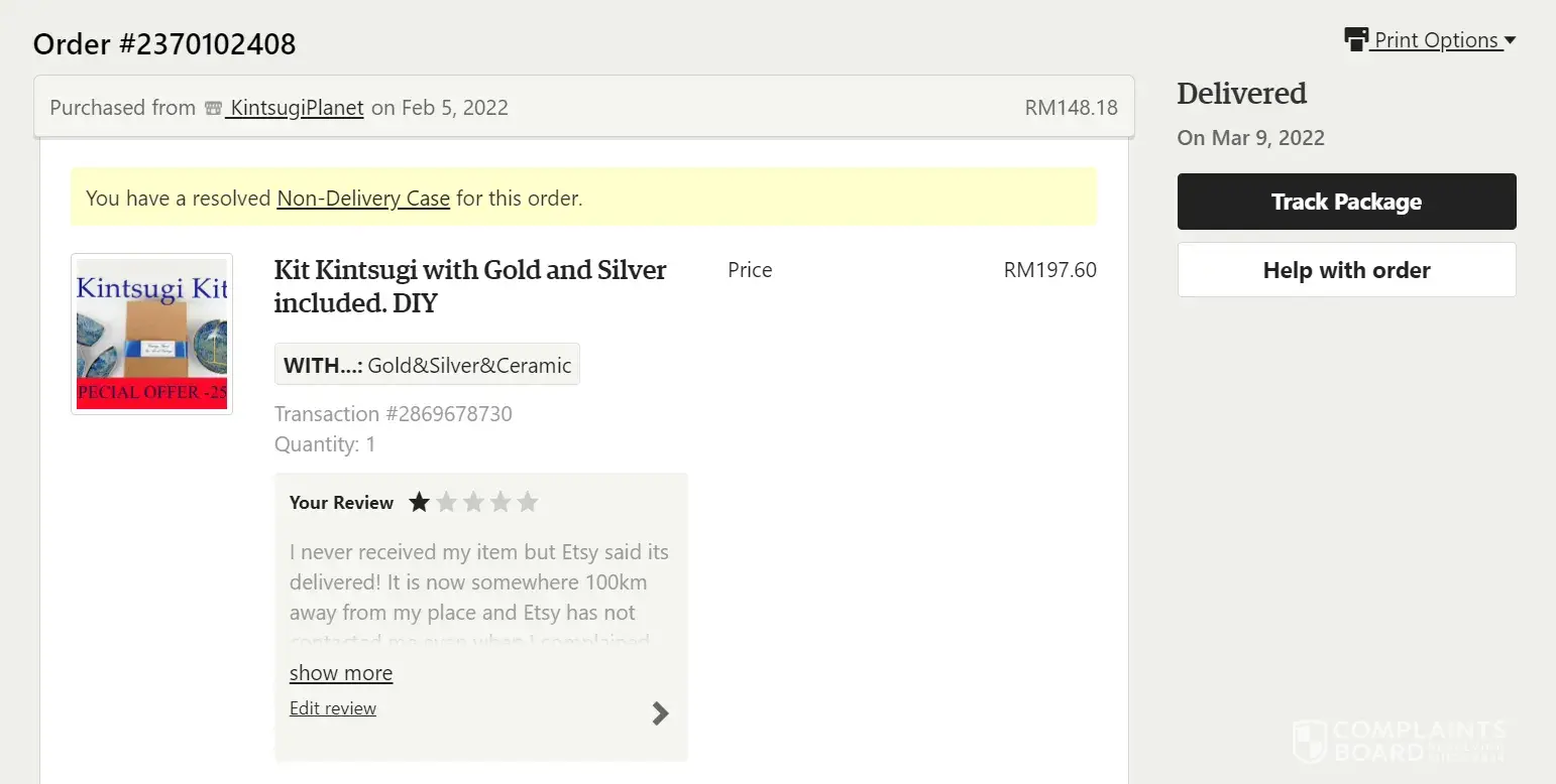I ordered an item (Kit Kintsugi with Gold and Silver included. DIY) on Feb 5th. The estimated delivery date was Feb 24th. On 4th Mar, I contacted the seller (Mary Johnson) on Etsy to inform that my order was not here yet. I got a reply that they will look into it. Then I waited again. On 10th March, I get an email from Etsy informing that my order was delivered. But I never received it. Not even my neighbours, I checked the tracking order, it reached the sorting center in Penang, that was it. On the same day, I informed the seller again. The seller replied they will checked with Etsy. On Mar 13th, I messaged the seller again, but no reply. So I opened a case on the same day with Etsy. Today (Mar 14th) I get an email from Etsy saying they have closed the case because my order has been delivered.