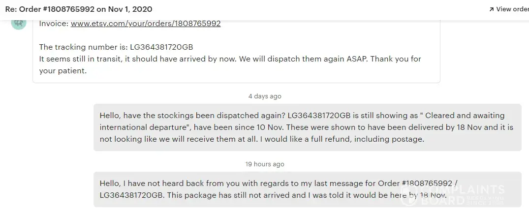 I was told delivery would be made by 18 Nov and the package has still not been received. I have sent several messages, the last two requesting a full refund including postage and she has not responded to me since. Her T&C's state to contact her within 14 days of delivery, but this package has not been delivered.