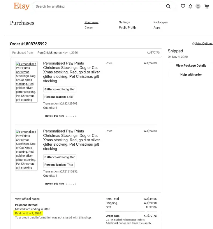I placed Order #1808765992 for two personalized Christmas dog stockings with Pom Chick and paid in full on 01 Nov 2020.