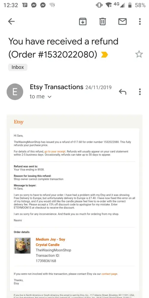 I have ordered from Etsy before and have given a gift card to my daughter in law and have never had a problem. If you could refund my money, I am happy to move on.