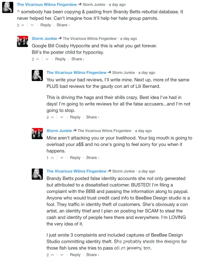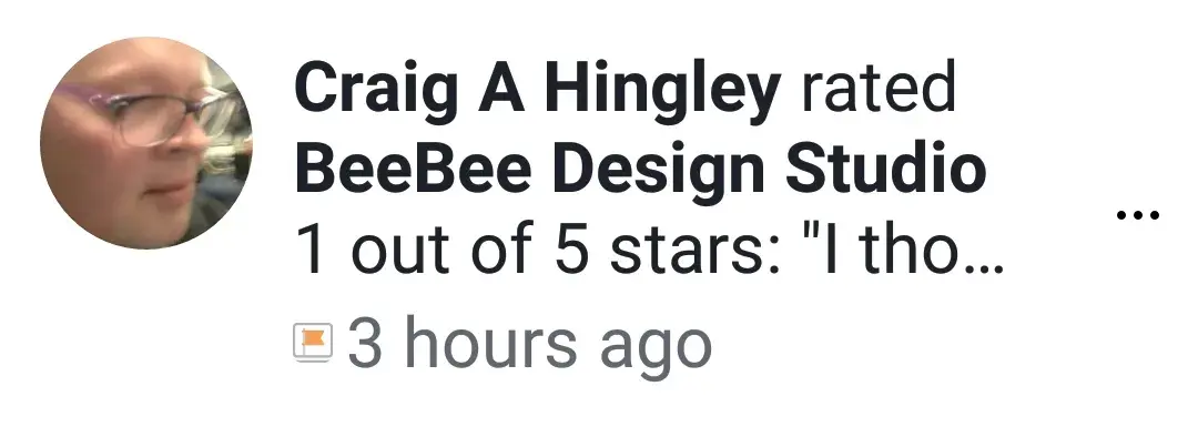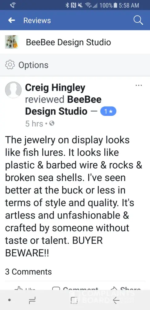 Please be aware that Mr. Craig Hingley has never bought any product from me, nor has he ever contacted me for any reason regarding my business. Mr. Hingley is obsessed with a few of the sexual assault survivors I work with in my spare time, including Bill Cosby's victims, and this is his way of lashing out at me for supporting them. He has been doing this for about three years now. I have attached screenshots to show you the various fake accounts he's created to write fake libelous reviews of my business with the intent of harming me financially. All of his fake accounts have been reported and removed by Facebook, as have his fake and libelous reviews. I have also attached screenshots of some of his comments on social media that demonstrate his sick views toward women and rape survivors. Please visit my facebook business page "BeeBee Design Studio" to read actual reviews of customers (including friends and family) who have actually bought items from me (and some who simply admire my work), and if you'd like proof he hasn't bought anything I can happily provide that if you private message me on that page. Thank you.