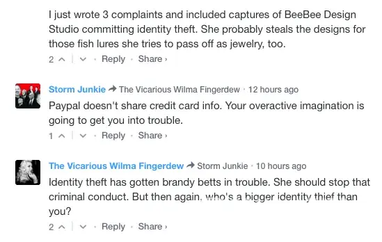 If that's not enough, simply note the escalation in his claims on this review alone: First, he claims he was "verbally abused", then when I produce evidence that he created false accounts and reviews, he escalated his claims to "death threats". Also, he first claimed I "refused him a refund", then he escalated it to "I stole his identity". First he's only referring to me, Brandy Betts of BeeBee Designs. Now, he's using terms like "they". Who are "they"?