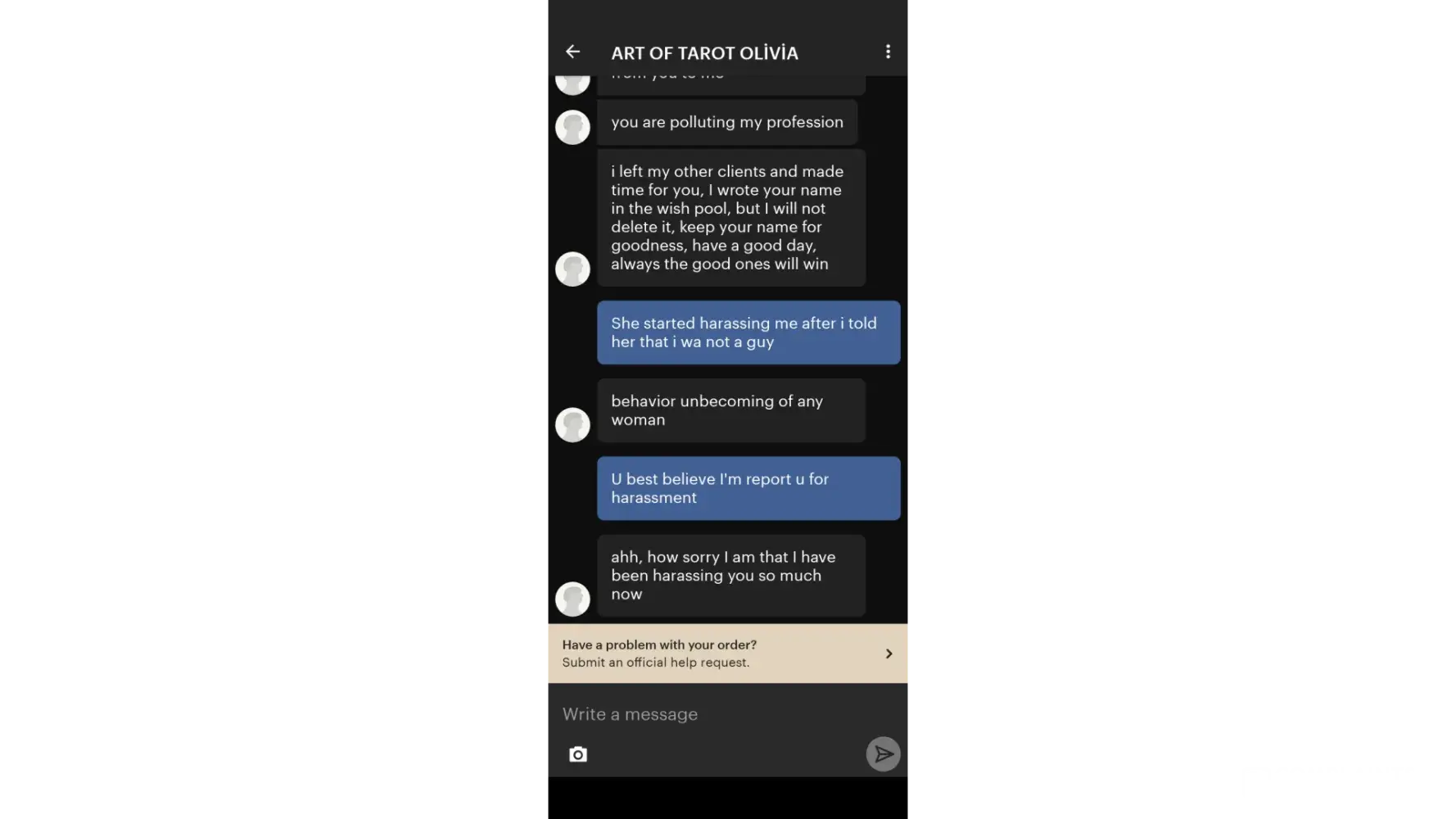 I want to report a seller on Etsy.i ordered a card reading and she messaged me calling me sir after I had sent her my information that I was a women including a picture.i correct her that I was a women .she started telling me stuff which I didn't appreciate it.i just want a simple card reading.i sent a screenshot of the seller porfile.