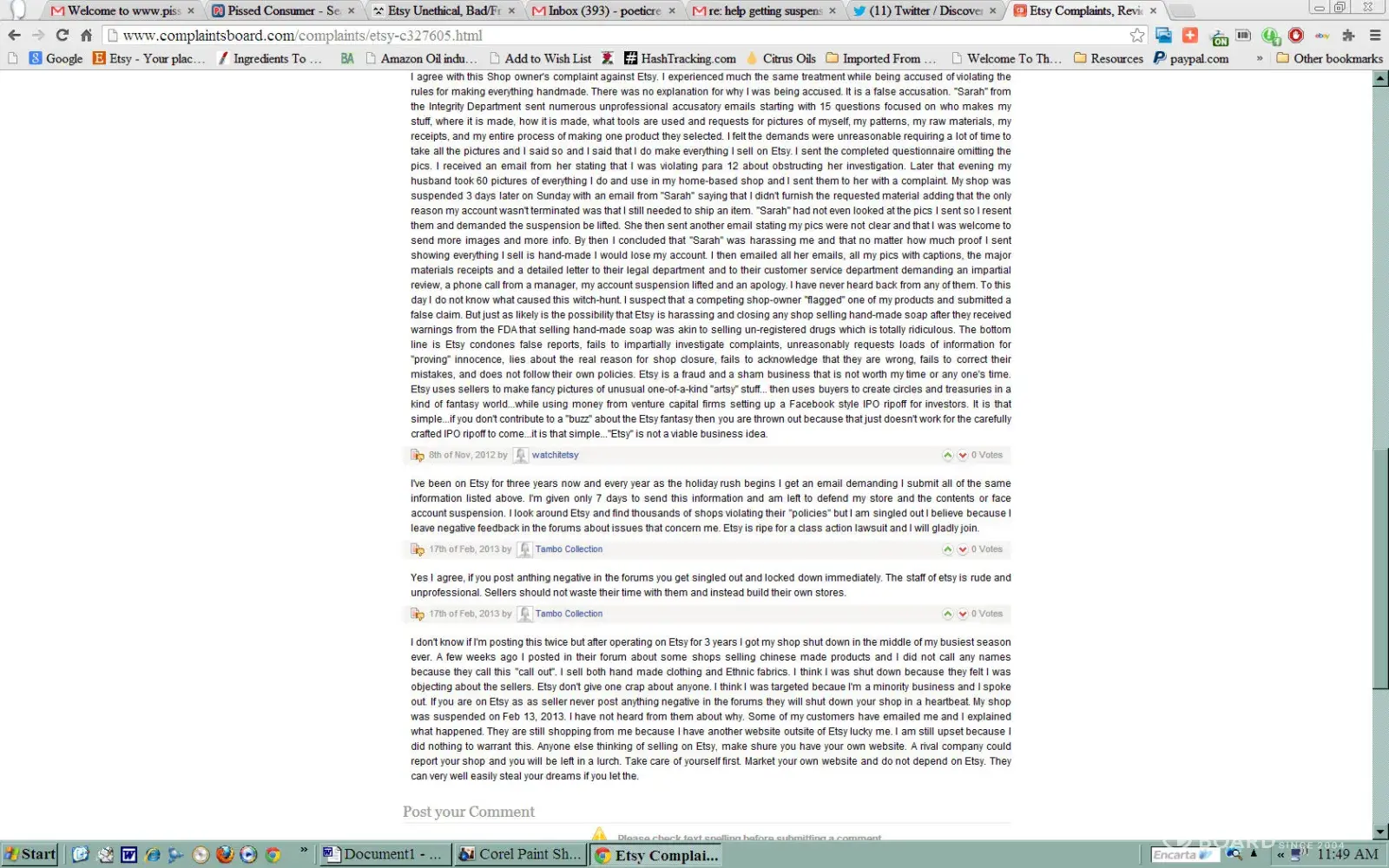Etsy closed my account permanently when I complained about undeserved Negative Etsy Feedback from an Internet thief and scam artist (see Shalane Doucette, or [a/k/a] ‘Lanie Bulzachelli, ' and/or (Palace Cats) ‘palacecats, ’ PalaceCats, Inc., 7206 Jasmine Road, Fort Myers, Florida, USA). When I complained, they suspended my account for a month. I kept my Etsy Listing Fee bills current, even paying for the month my account was suspended. When I complained again, they disabled my account, closing it permanently. While researching Etsy's rules and regulations, I discovered that Etsy has gone from the "hand-made" only sales website to something that resembles Ebay, for resellers only, selling trinkets, and although these trinkets are "hand-made, " they are hand made in a China sweatshop on an assembly line. I was originally disappointed with Etsy, but there are many other Internet websites (NOT Ebay) that surpass Etsy's traffic volume, hits and sales! Internet websites such as 'Bidstart, ' "Zazzle, " "Froogle, " "Yahoo!" These websites promote your sales items better, get more traffic and hits and they are not unscrupulous, like, unfortunately Etsy has become!