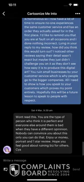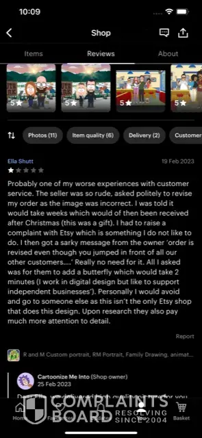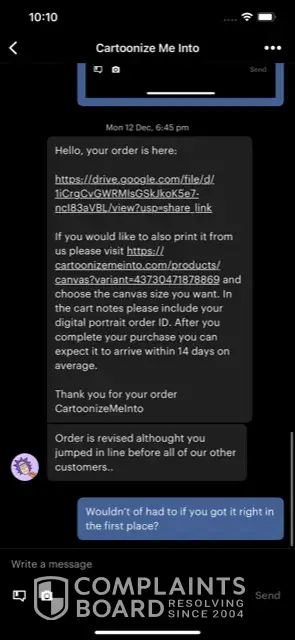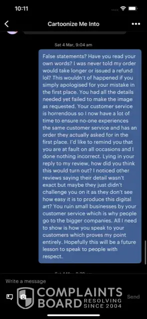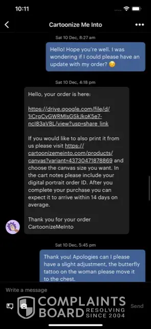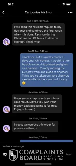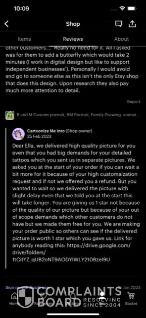 - 25th February i had a reply stating that i was apparently told in advance with how long the order would take (apparently longer due to detail) and offered a refund which is incorrect. They have also used the link to my digital purchase without my consent to see what others view in regards to the image when actually my review was based on their customer service.