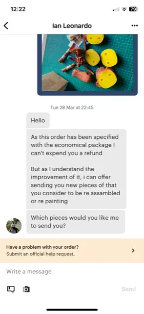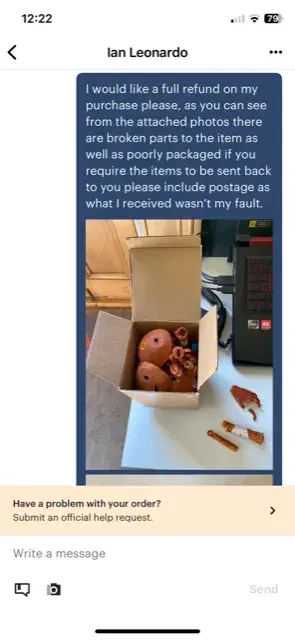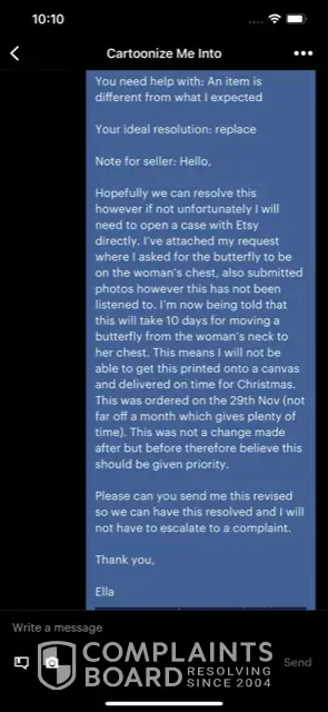 - 11th December opened a case with Etsy and asked for a replacement. Apologised for having to do so as i didn't want to.