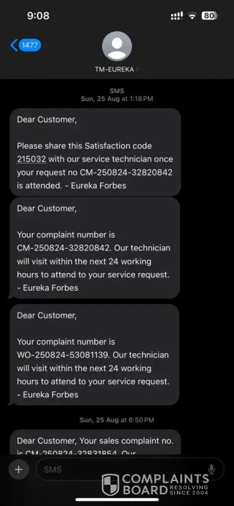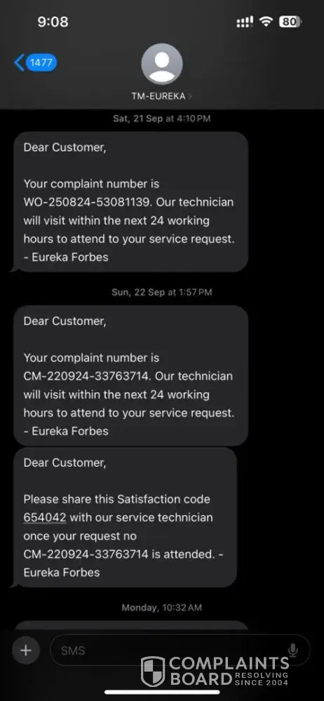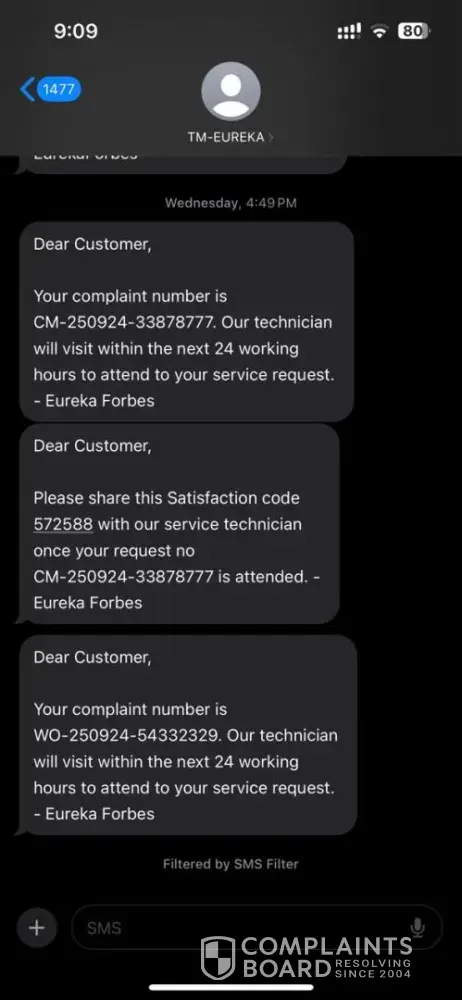 Dear, I received this message from Eureka Dear Customer, Your complaint number is WO-260724-[protected]. Our technician will visit within the next 24 working hours to attend to your service request. - Eureka Forbes Clarification Required on Service and Contract Issues We have received the message from your service centre, but we cannot accept it as we never...