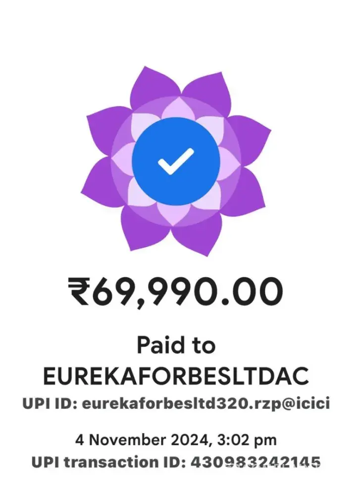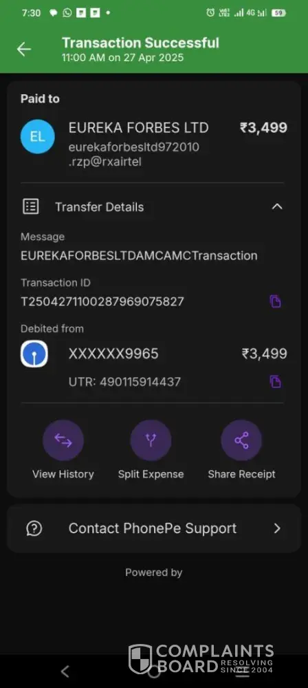 Purchased Eureka Forbes Water Purifier in the month of October 2023. Company suggested for renewal of AMC. This was done and amount of Rs.5532/- was paid in October 2024. AMC Order NO SO-[protected]. There is no feedback from the Company, even after 3 months. Company’s local representative suggested to download Eureka Forbes APP. APP downloaded for AMC...