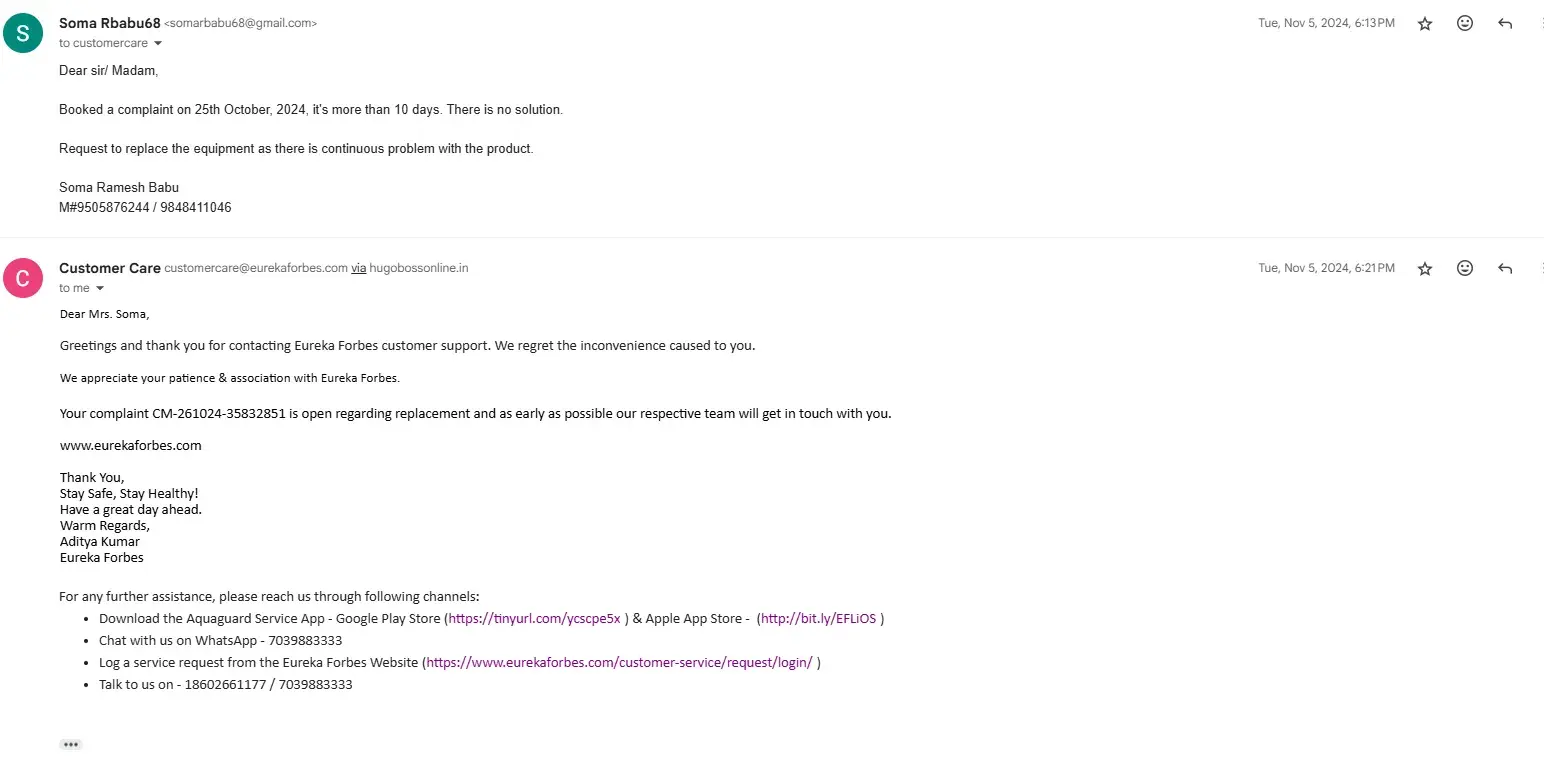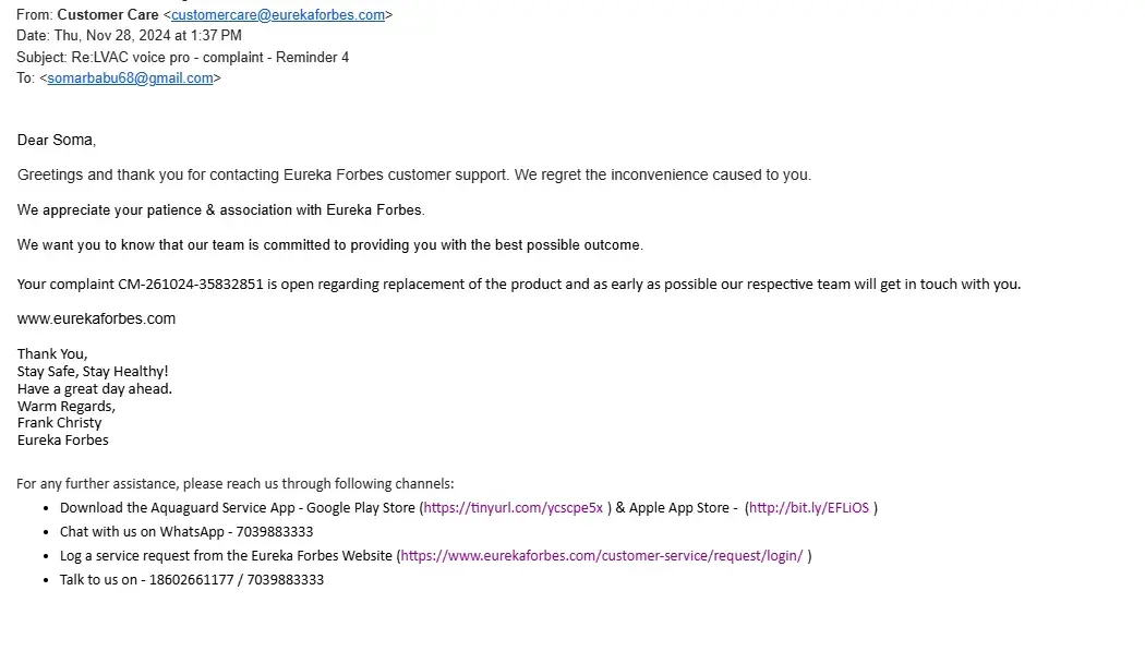 Purchased LVAC Voice Pro from Eureka Forbes in the month of Apri, 2024 and day one facing problem with the working of the machine. Finally asked for replacement in the month of October, 2024 of the machine due to frequent breakdown and raised the complaint through app as well as customer care mail and telephone. It's more than 3 months there is no attempt to resolve the problem. Whenever contact the customer care customized answer from so many care executive with the same customized reply thank you for your patience and your complaint has been escalated and will be attended soon.