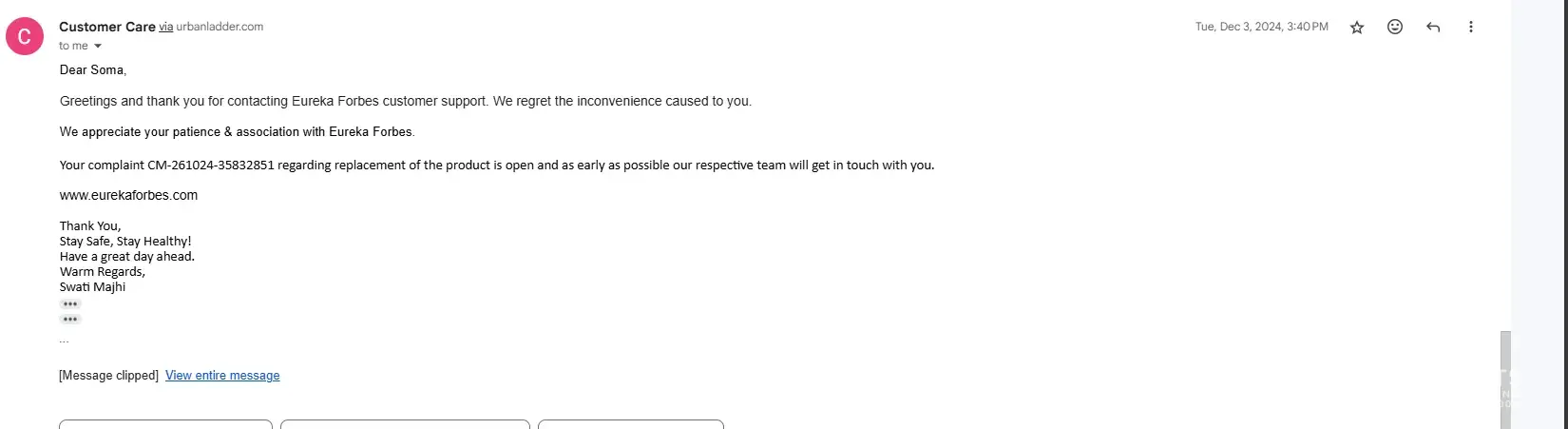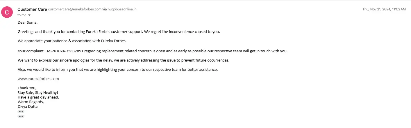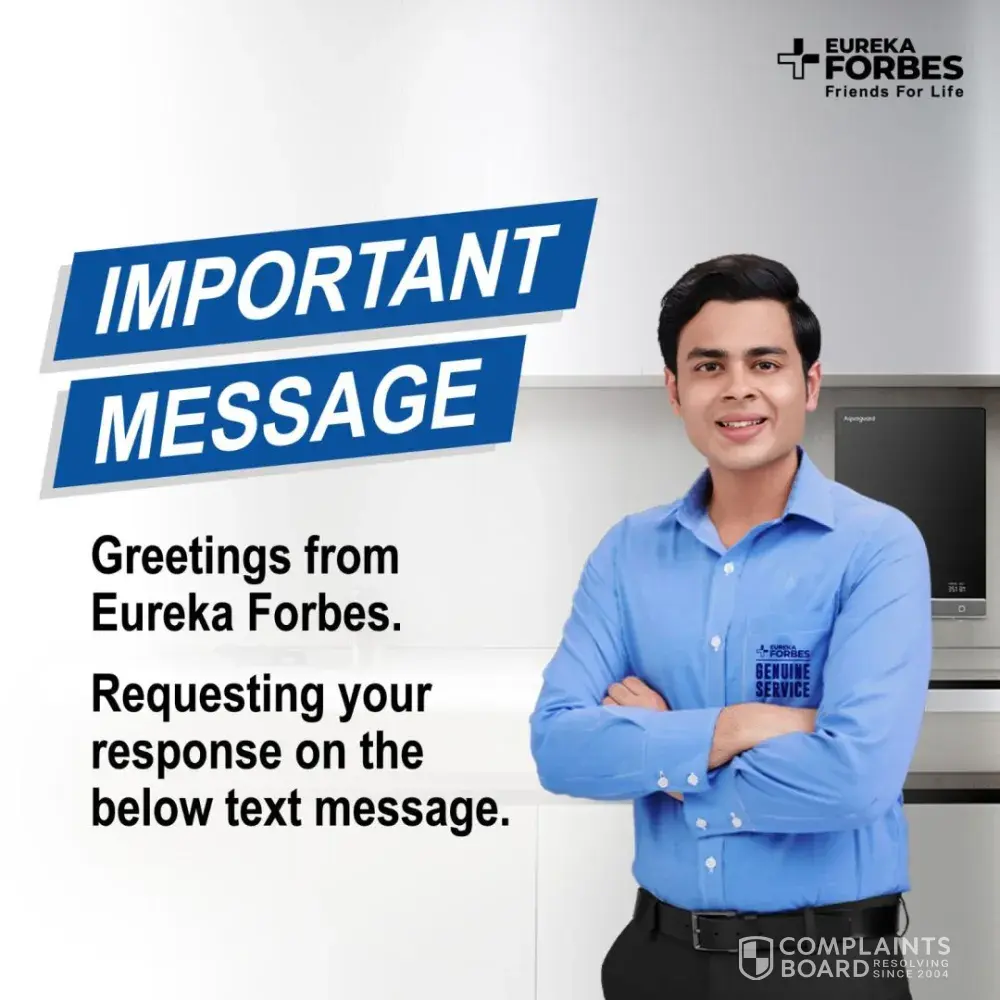 We appreciate your patience & association with Eureka Forbes.