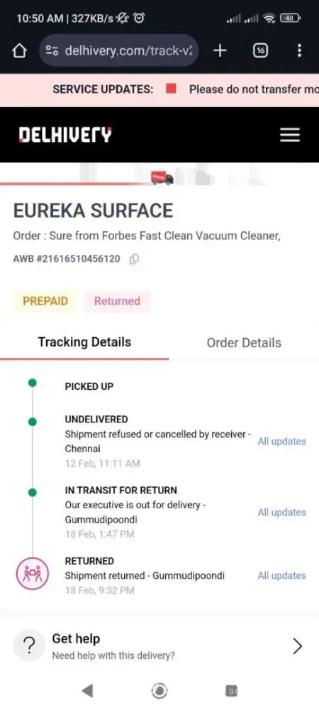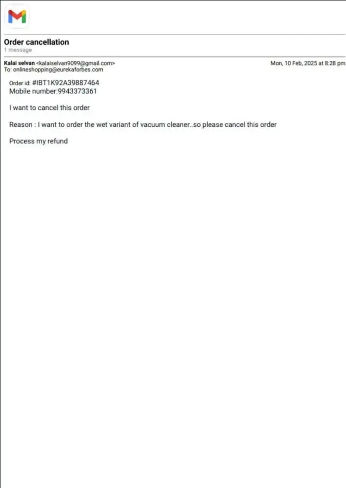 I cancelled the order on 10th February via both call and email, and I did not receive the product. The shipment was returned to the Eureka warehouse on 18th February at Gummudipoondi.