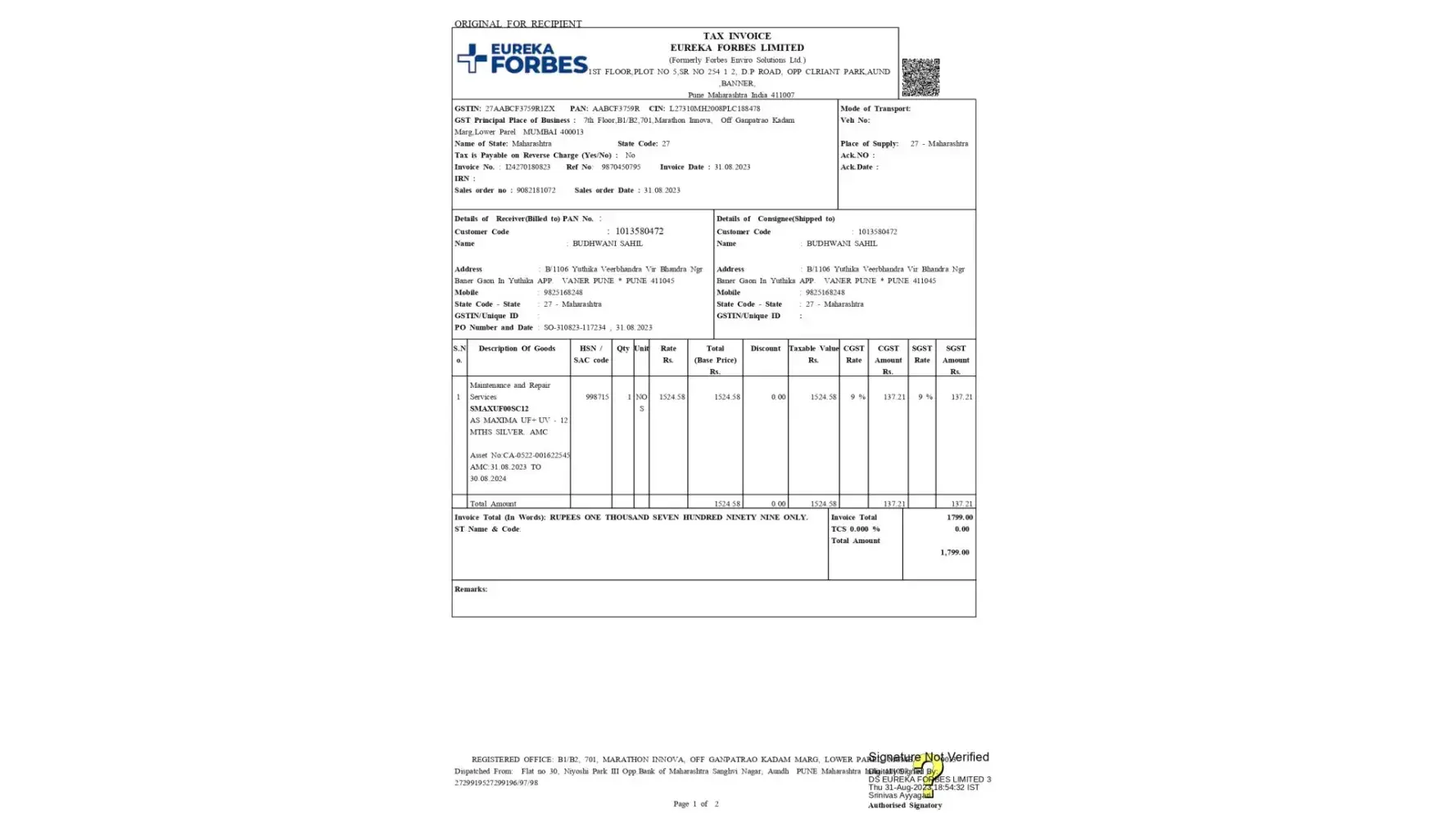 I purchased the AMC silver plan from EUREKA FORBES LIMITED on 31st August, 2023 (document attached).