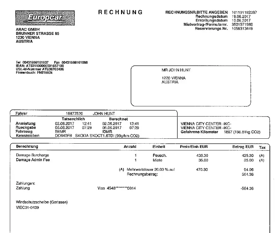 My name is John Hunt and I rented a Skoda 1.6 TDI from Europcar Vienna from the 2nd to the 6th of June 2017. I picked up the car in a darkened garage and looked closely at the paintwork to see if there were no problems - and no problems found. 30 minutes later my son from the outside of the car saw a small defect in the front windscreen that had suffered a hit by a stone. This damage was below the dashboard line and not possible to see from the motorist and passenger positions. The damage was reported to Eurocar on the same day, with photos. On my return Europcar charged me EUR 564.36 for changing the windscreen. The damage was clearly existing before I picked up the car, I did not see it before I drove out the garage, and it seems to me that Europcar charged me for damages that were not caused by me. Whether they knew about the damage before they rented the car is a unanswered question.