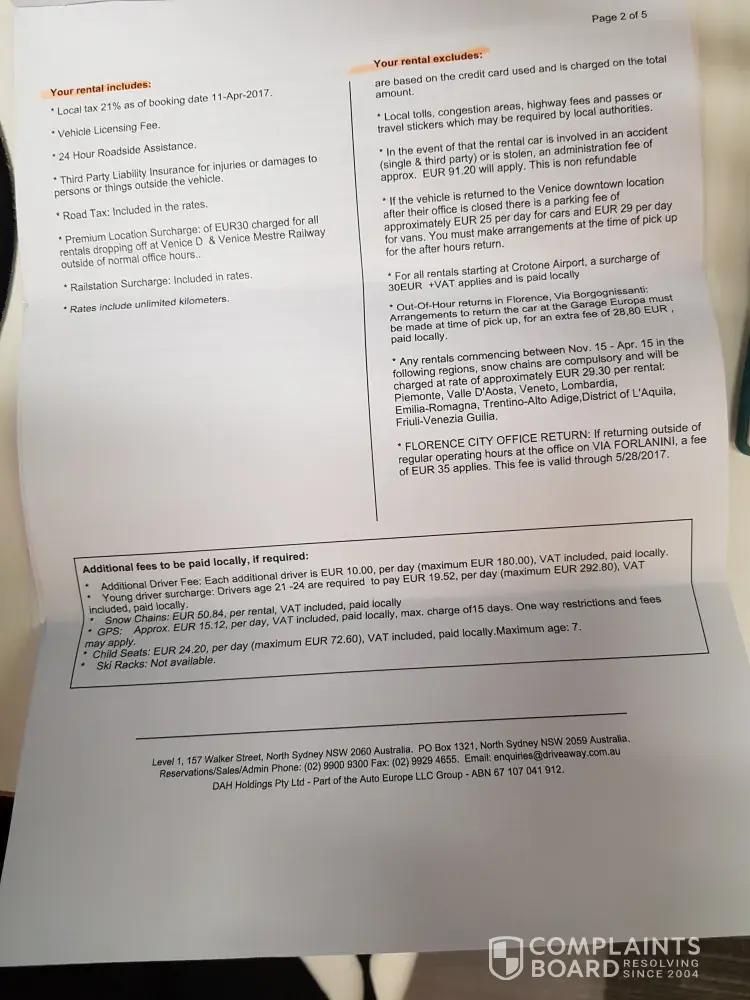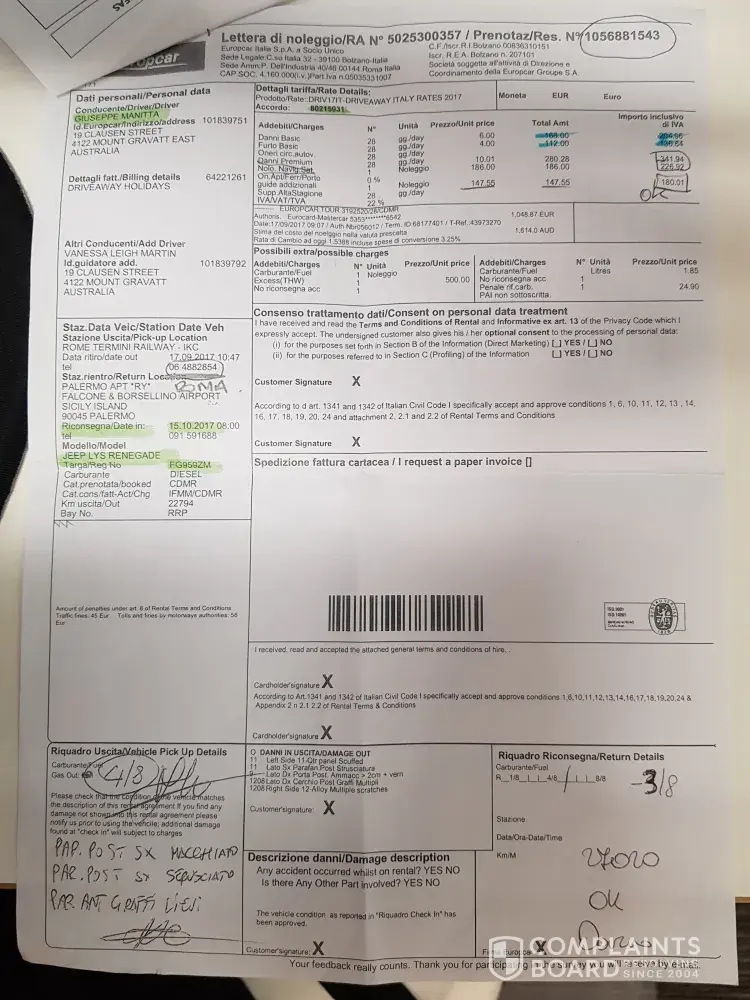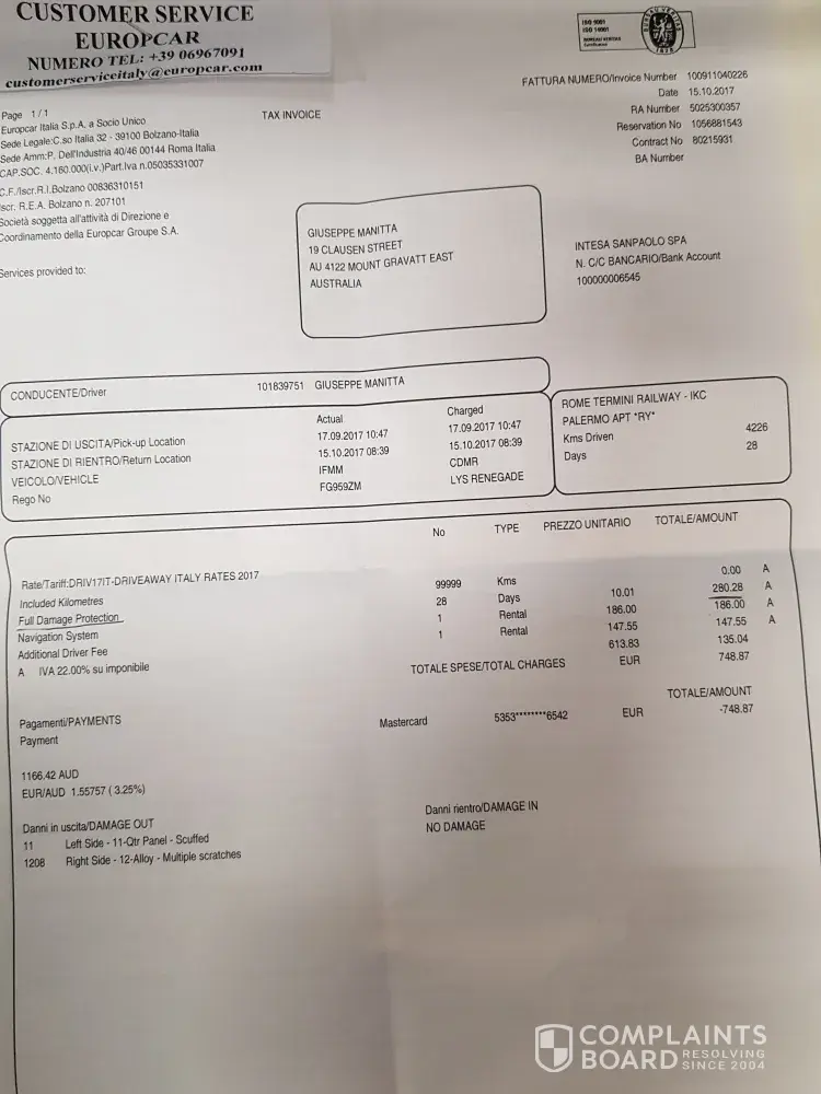 The next day my partner was checking his credit card statement online and saw the holding deposit from Europcar and was incredibly shocked to see the amount. We were very confused & didn't understand why it was so much. When we got to our next destination we got out our paperwork and tried to work it all out. This was all written in Italian so we could not understand anything that it said except the amounts. EUR1048.87 We tried calling Europcar Customer Service, the pick-up counter in Rome, no one would answer our calls. We tried calling Australian Europcar to be told they couldn't do anything. We spoke to our travel agent in Australia who tried to help bu they couldn't either as it was all in Italian. They said we had to deal with the company in Italy.