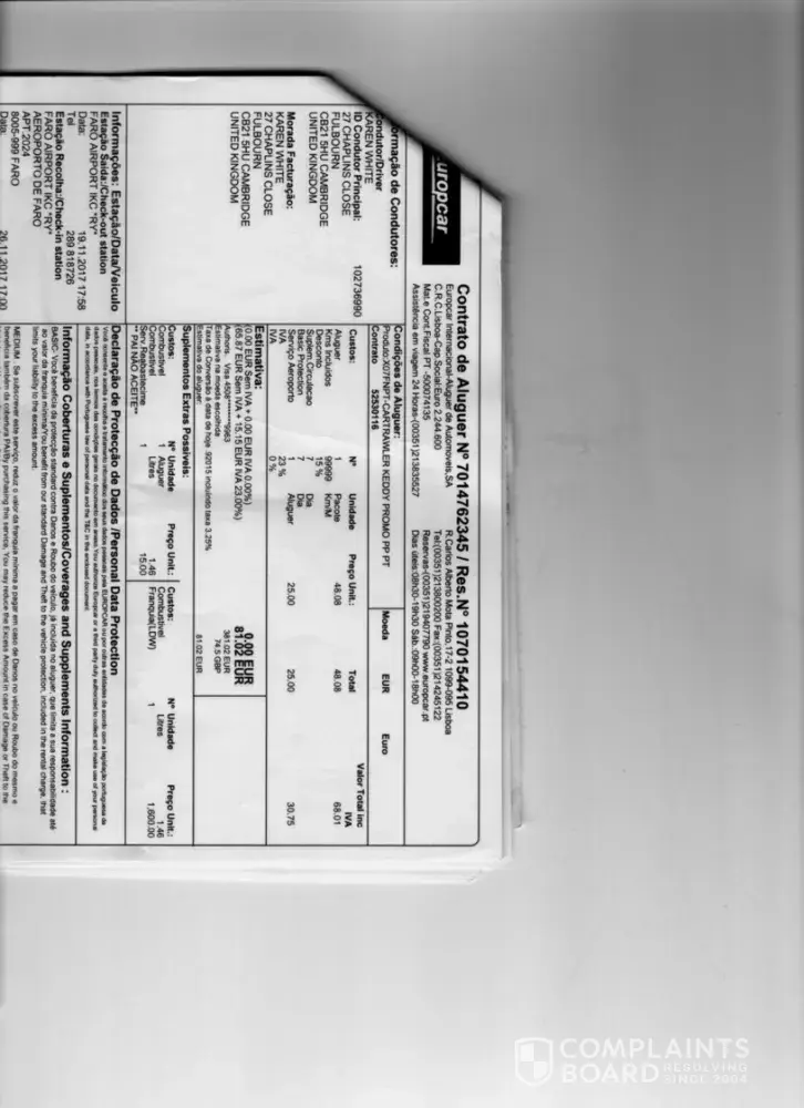 our contract was with indigo car hire and the staff member was Conner Shearman and our contract number was PT [protected] 0n the 31st October 2017 when we were advised of price and payment of 81 Euro's payable at collection point and we agreed to a payment of £34.53 to secure the booking .