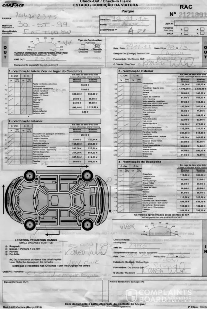 We received no further communication until 12th of October 2017 where we got an invoice emailed with an extra charge of 76.13 euros stating damage repair. This amount was taken from our credit card along with the agreed rental amount. We sent a request to customer service asking what this charge was as there were no damages and we were advised that the charge was due to an accident report not being submitted.