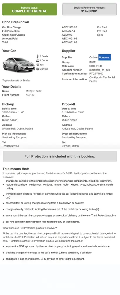 We booked a rental car though www.rentalcars.com in November 2016 for our holiday end of Dec 2016 in Ireland. We paid AED3001.06 which was for a Toyota Avensis and included full protection. When we arrived in Dublin on 20 Dec 2016, Europcar told us they they don't have this car for us, but can give us a Hyundai ix35, and will actually be cheaper than the Toyota we booked.