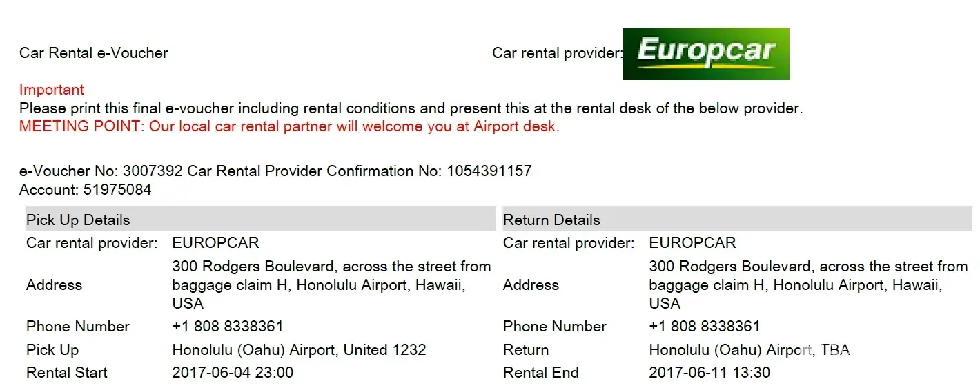 On the 3rd of March 2017, I paid a deposit on a car for pick up at Honolulu Airport on the 4th of April 2017.
