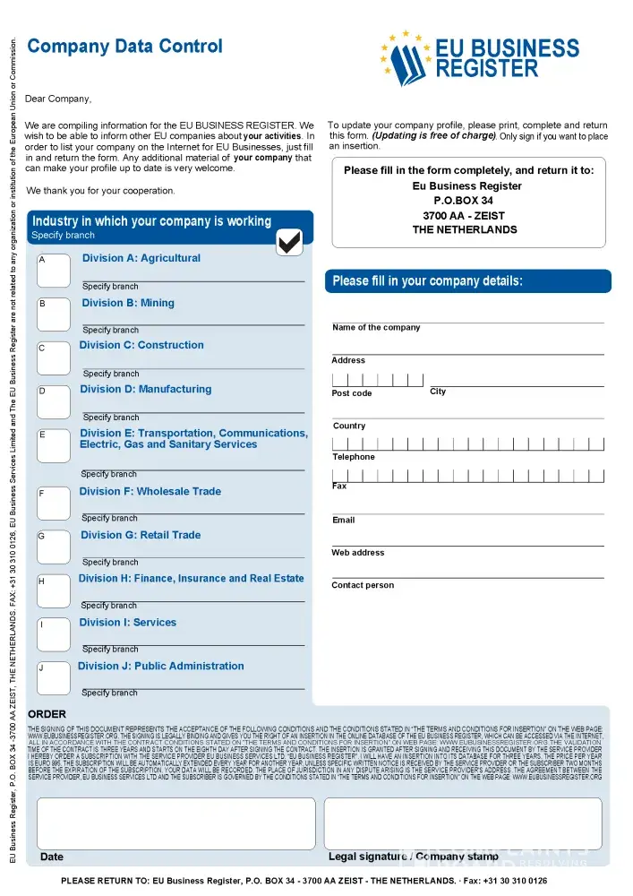 In order to have your company inserted in the eu business register for 2017/2018, please print, complete and submit the attached form (pdf file) to the following address: