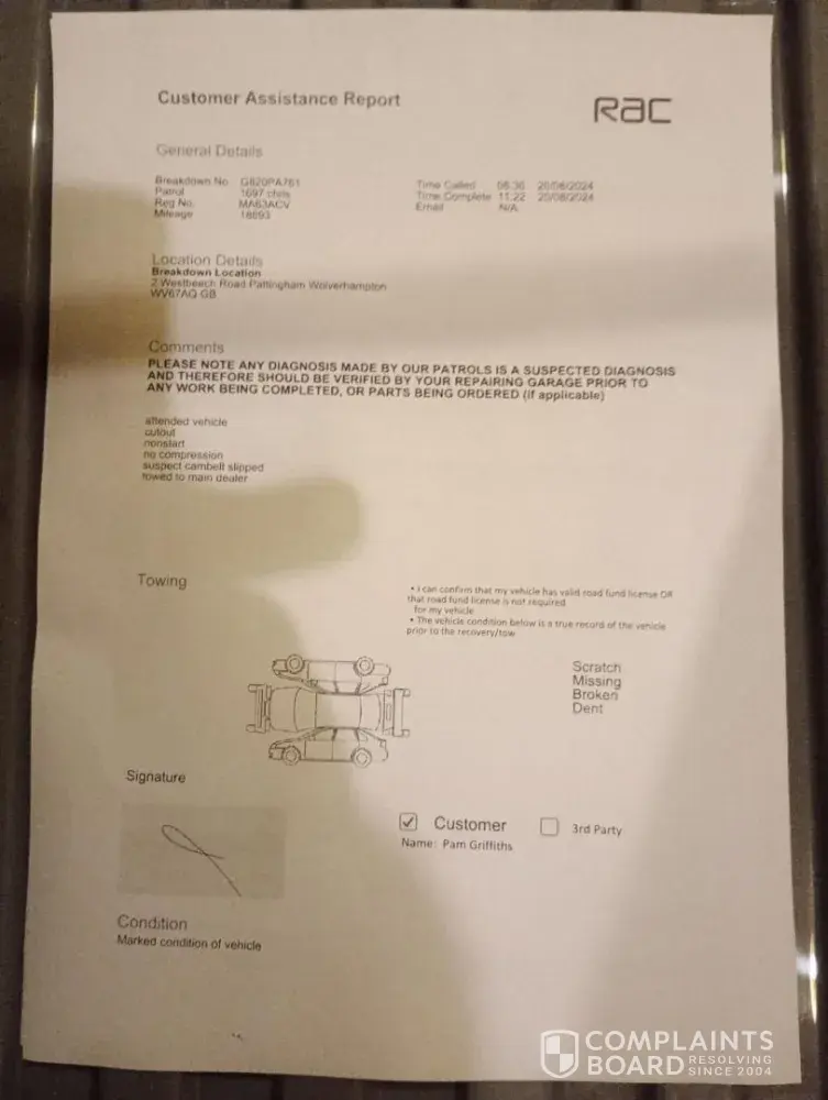 I am Norman Farr, I have been the point of contact for Mrs. Pam Griffiths with concern to her car which recently broke down. I am the partner of her daughter and am dealing with this as Pam is 79 and lost her husband two months ago. • The car is a Ford B Max MA63ACV. • The break down happened on Tuesday, 20th August, in Pattingham, at a junction in a...