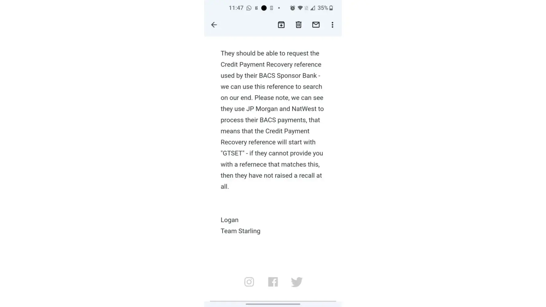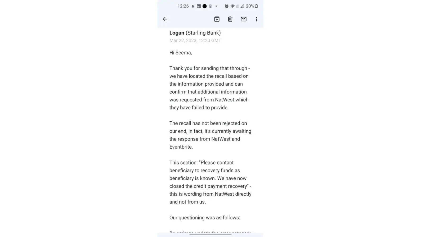 Desired outcome: £320.00 returned to me. They need to respond to natwest questions so the recall process can be completed . See recent email from Starling :"They have been sent 2 questions which they haven't answered,