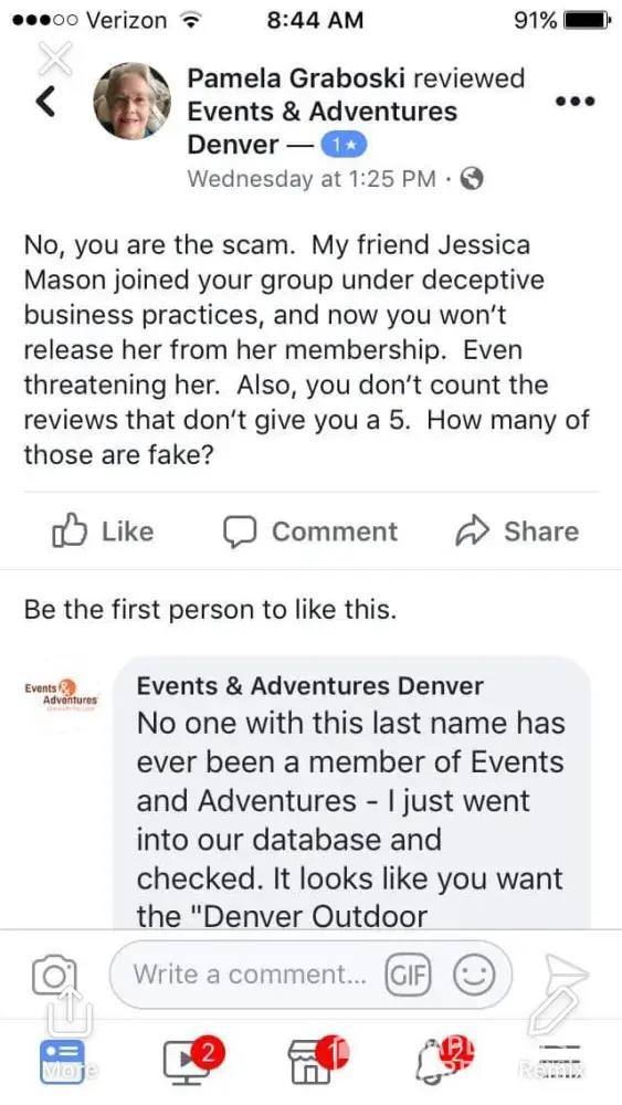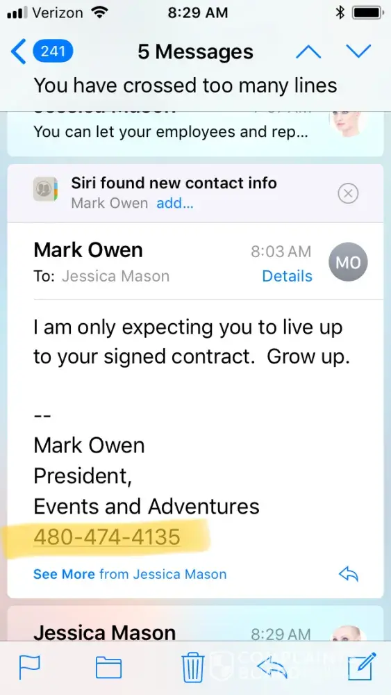 A little later that same day, the president, Mark Owen, emailed me and rattled off a list of accusations about my behavior--that I was slandering the company, harassing staff, and so on. So if you follow up with someone who originally reached out to you about a legit complaint, E&A terms it harassment. Just like their sales pitch...misrepresentation of the facts. And let's add "refusal to do anything, but count the bank roll". So the president of Events & Adventures uses a psychological mind game of inaccurate finger pointing to turn the table on a legit complaint I have made--to somehow bully me to back off on my complaint?