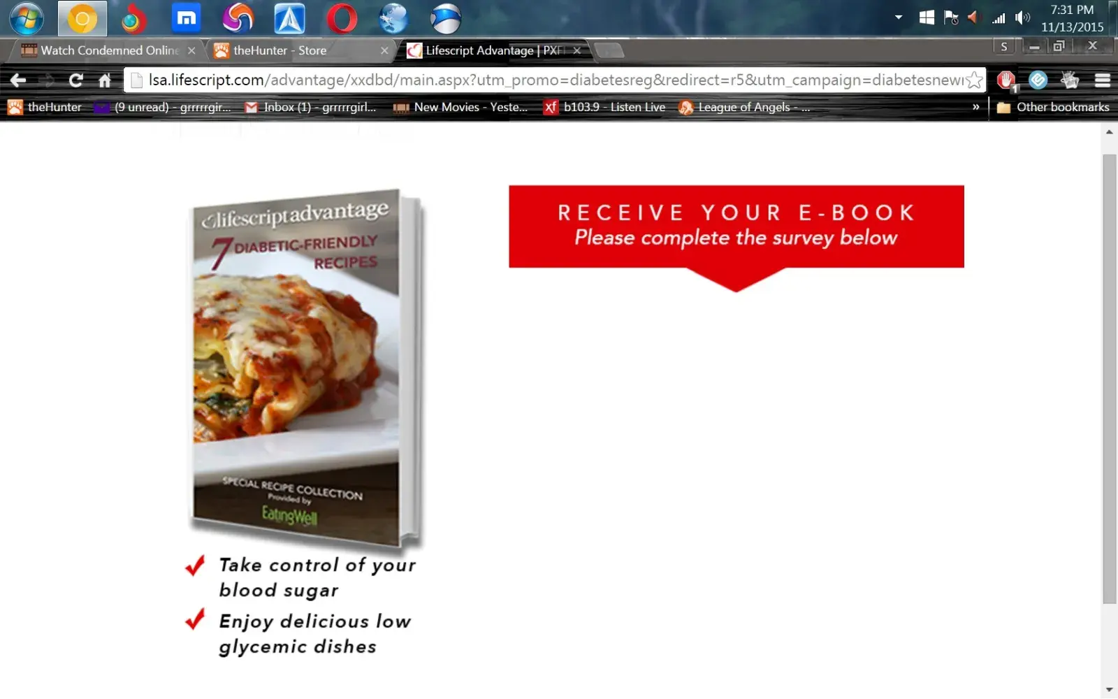 I just started the diabetes recipe offer.After giving all my god damn info the next page said to do the survey, but the fking page is blank. I am reporting the site to the BBB. I have had it with this lifescript advantage website. I am done getting screwed.