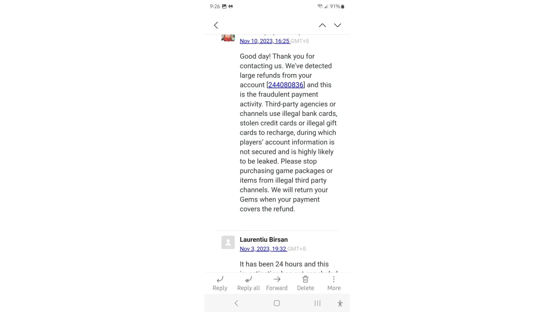 On November 2nd I logged in my Evony account and saw that over 2.1 million gems from my account were gone and I had 0 showing.I saw an in game mail accusing me of fradulent activity and purchases and for that reason the gems I had about $1,000 in value have been removed(as of now that customer support mail has been removed from my messages by customer support).I have opened a ticket and also sent email to customer support asking what transactions they were talking about and I offered to show them proof of every in game transactions I made that would prove it was done using my credit cards, paypal,Amazon coins.In one of the emails I received they asked me what do I think triggered my account to be flagged.Really?How do I supposed to know.After they said they will investigate next thing I see is that my ticket wad closed without any follow up or resolution and I received an email saying that my gems will not be returned until I pay back money I owned to Evony, again no ammount, no proof no transaction mentioned as it will show in the screen shots I attach.