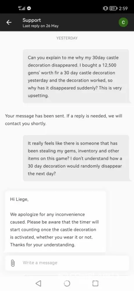 I bought a 30-day castle decoration for 12,500 gems exactly 3 days ago, which was Friday the 24th. I put it on my castle and logged off. Then I logged back on the next day in around one hour and 20 minutes before svs started. The decoration was gone and no longer active. I searched for both my gems and found I still didn't get the 12,500gems back and that...