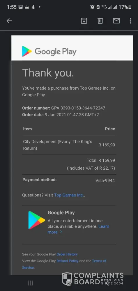 Attached are receipts of the 2 latest purchase from the game via Google play: