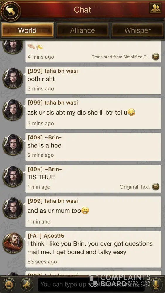 My alliance and many others in S100 have reported harassment and racial comments being made. Woman are now being harassed on a daily bases, the play gets muted for a week then returns to doing the same behavior over and over again. At this point he needs to be banned from his account and lose all access. I'm only going to attach 2 photos, however I have sent at least 50 to customer service and nothing happens. Other players have done the same. There are 2 players in the server that constantly harass and make racial comments especially towards women and this is not okay. I'm tired of reporting the issue and getting no where so now i will report on every site i can to get the problem out there. Customer service has tried muting and it only last week then we go back to the daily BS. ARAGORN ID# [protected]