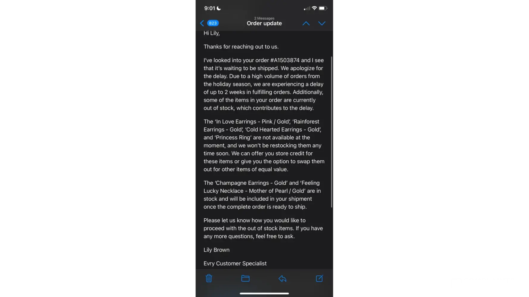 I placed an order on November 27, 2023 for two jewelry items (a personalized bracelet and a double cross necklace). The order number is A1641020. I received an email from EVRY JEWELS on 12/25/23 that my custom order would be arriving soon. It is now January 12, 2024 and I still have not received any items whatsoever of my order. I’ve emailed customer service more than once and the only response I get is that they are experiencing delays.