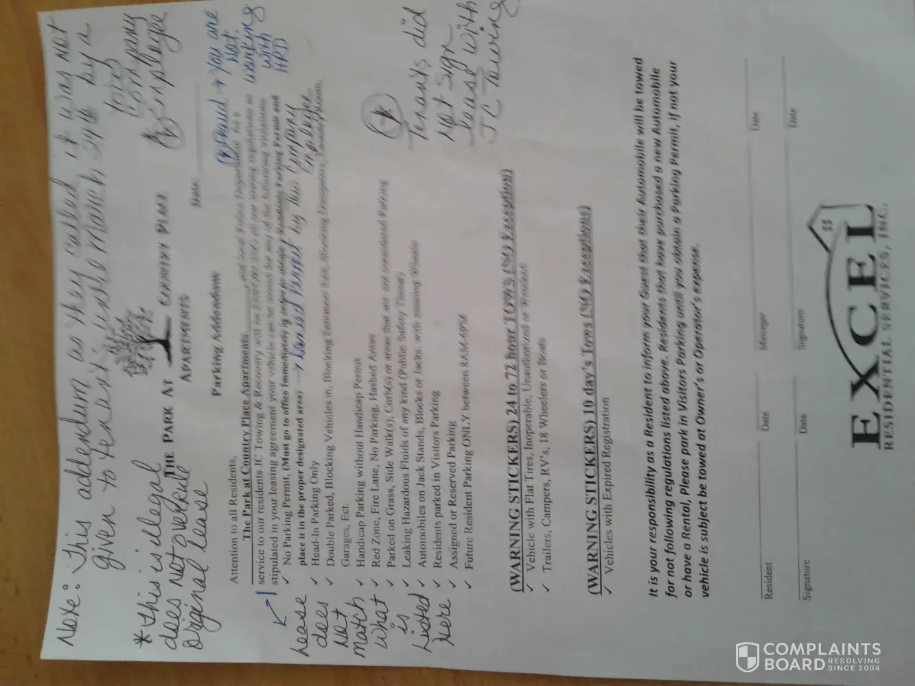 The Park at Country Place managed by Excel Residential Services, Inc. continues to violate tenant rights with ongoing unethical behavior. The current issue pertains changes made to the parking rules after the lease was signed which provided an assigned numbered space. The proposed change which goes into effect on March 31, 2017 with JC Towing. It started on March 9th when notices were left on tenant doors according to Texas Property Code this was not delivered properly. In this notice they are requesting copies of tenants current car insurance which again violates Texas Property Code Section 92.0131 and is a violation of privacy. When I spoke with an Excel Residential Employee she told me that my emails had been forwarded to the Regional Supervisor on March 9th. Thereafter they have not responded to emails or phone calls. On March 24 tenants had to go to the leasing office to pick up permits but were denied permits if you did not submit to giving a tow company employee copies of your car insurance. This is illegal since tenants signed a lease and they are in breach of the lease. What can tenants do when dealing with Slumlords such as Excel Residential Services, Inc. and The Park at Country Place Apartments